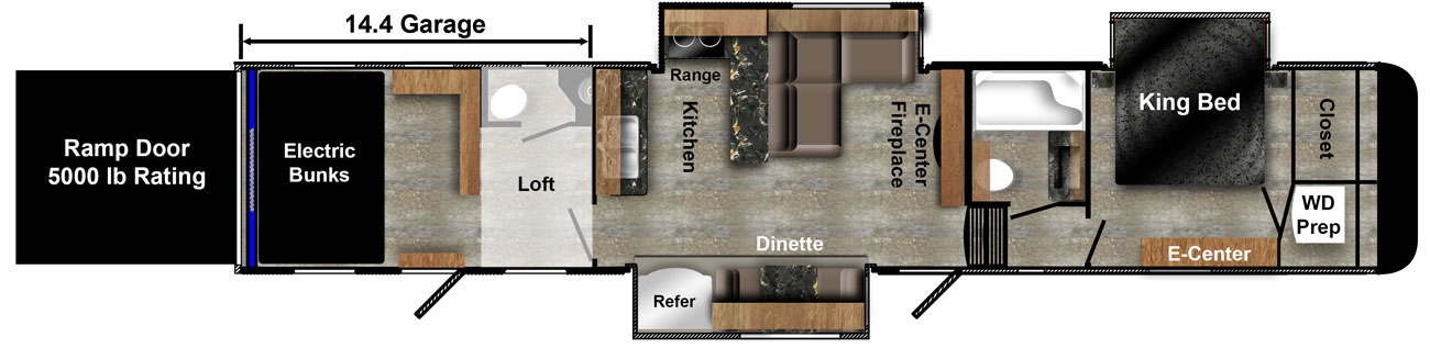 Luxe Toy Hauler luxury fifth wheel. We are excited about tracking this unit for you. It's our first luxury toy hauler taken from our popular Weekend Warrior 4250W floor plan. This new toy hauler has been re-engineered and upgraded to the luxury toy hauler 5th wheel class.